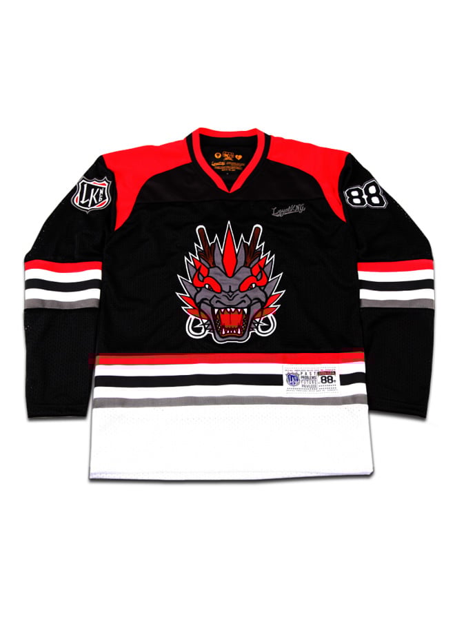 The "Yr of Dragon" jersey is our take on the classic hockey jersey style streamlined with a more slim fit and our own designer take in details. Although the year 2015 is of the Goat, we designed this jersey to celebrate the year of the Dragon, hence the 88', also the birth year of our designer. Pulling inspiration from anime and Aztec dragon designs, this piece stands as a key item from our Spring 2015 release.